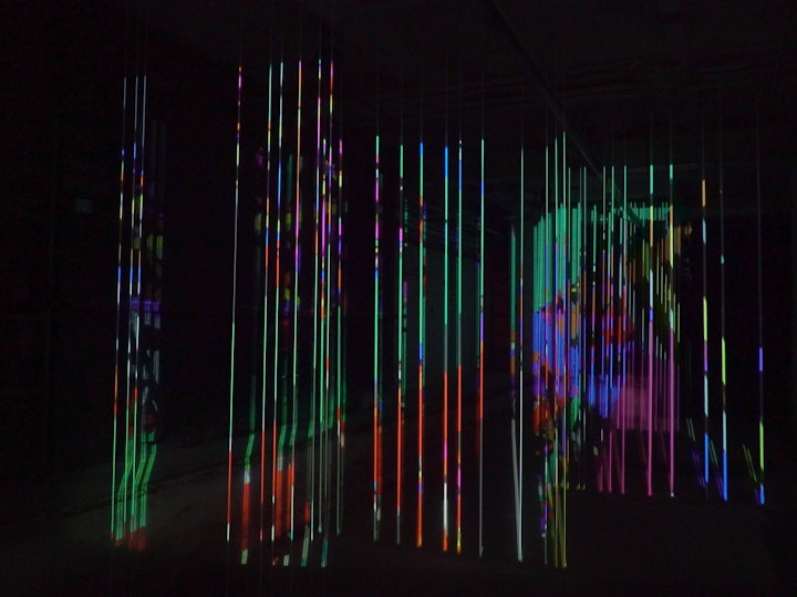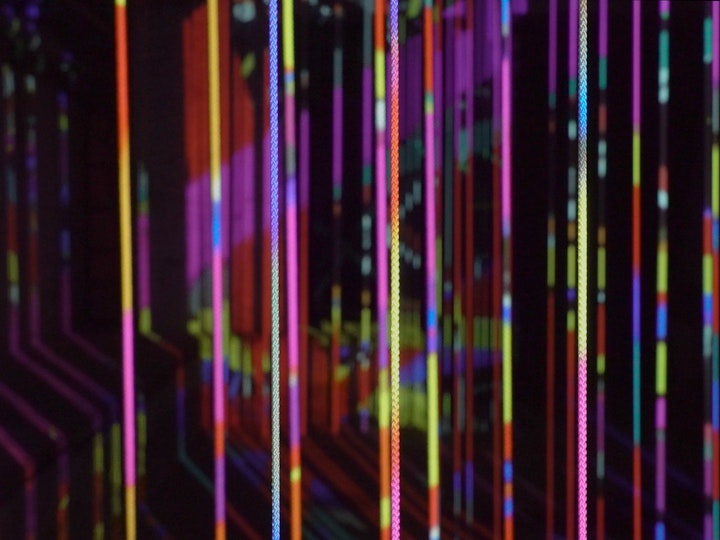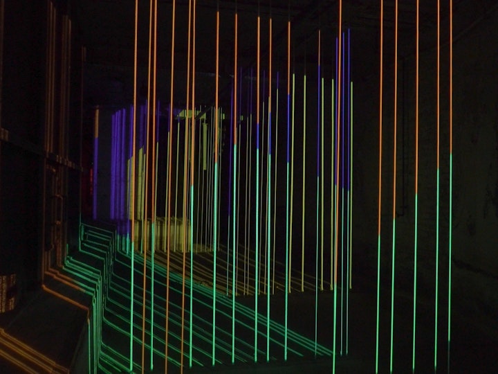 O.T. 1190 & Where we find the end is a visual installation of ropes and video projection and a sound installation by Karsten Schuhl. The artwork was shown in the group exhibition ‘Himmel unter Berlin - Vol.2’ in the cellars of a former steam engine factory in Berlin. Ropes of different thicknesses stretched vertically formed a spatial structure, while 6 loudspeakers were arranged in such a way that tones and sounds could move through the exhibition space.
